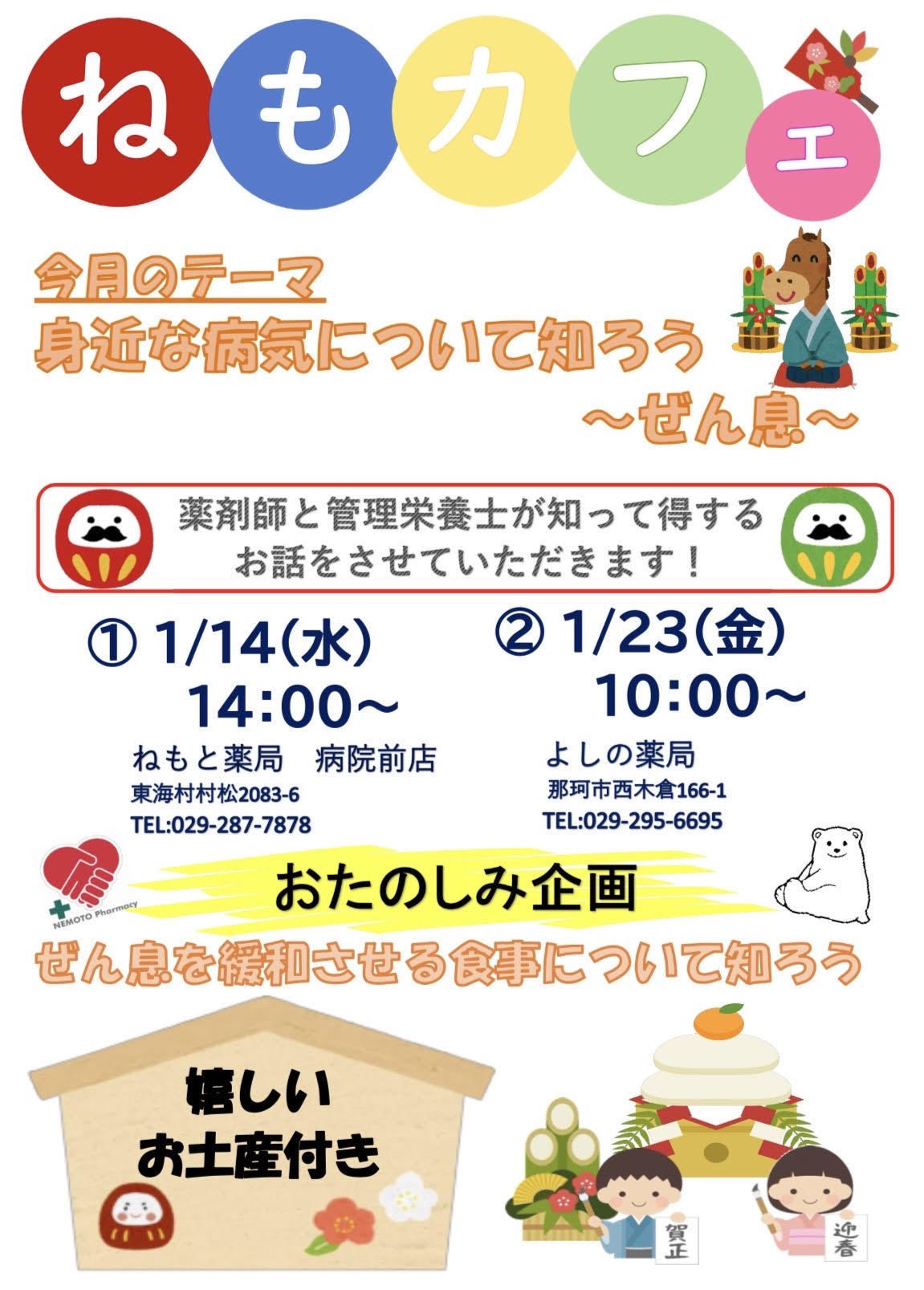 茨城県東海村を拠点に東海村・那珂市・大洗町・日立港に5店舗ある、ねもと薬局グループです。心に届く医療をモットーとし、患者さまと寄り添う在宅医療に力を入れた薬局を目指しています。栄養士による栄養指導も実施しており、ケアマネも常駐している薬局ですので、健康のことから介護相談まで何でもご相談を承っております。薬学生のインターンシップなどもおこなっております!また各薬局にかかりつけ薬剤師も常駐しております!どうぞお気軽にご相談ください。全国どちらの病院の処方箋も受け付けております!!